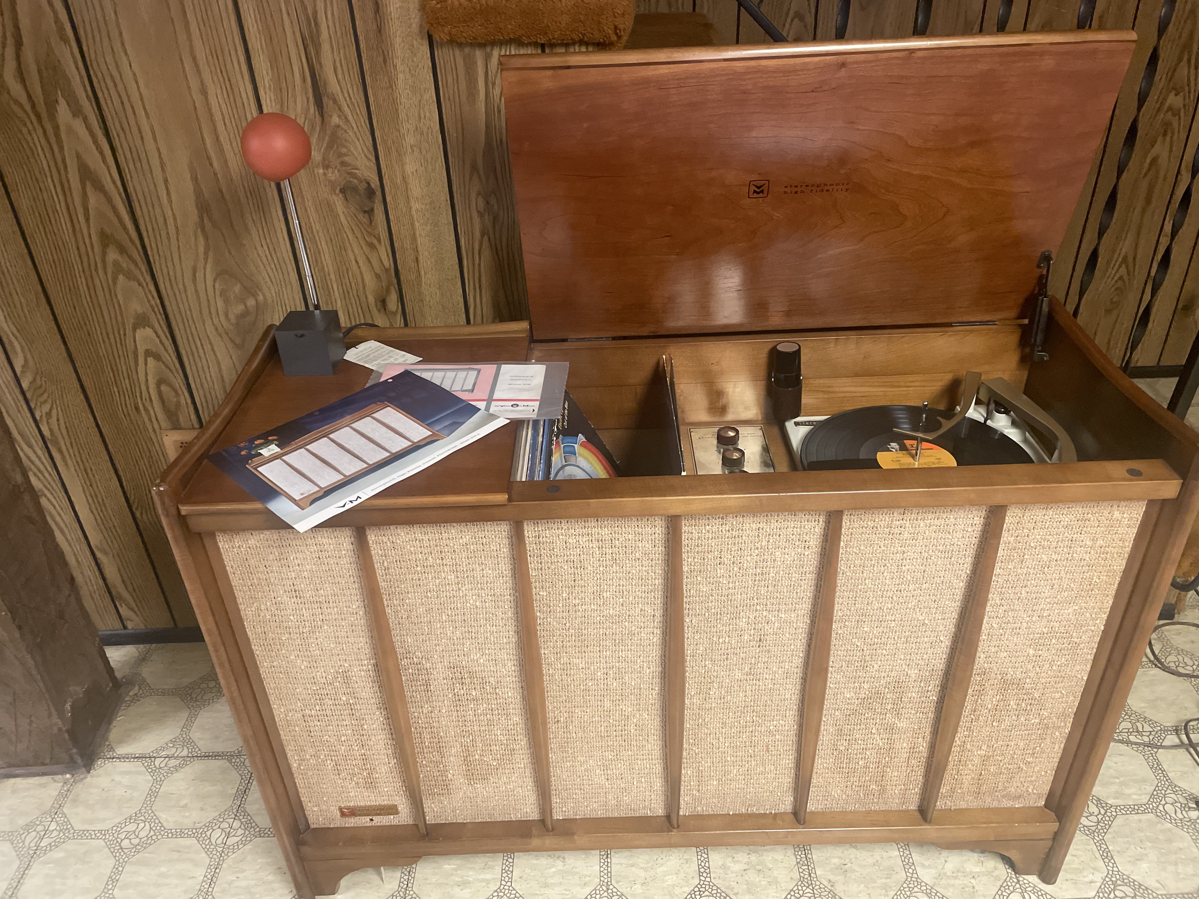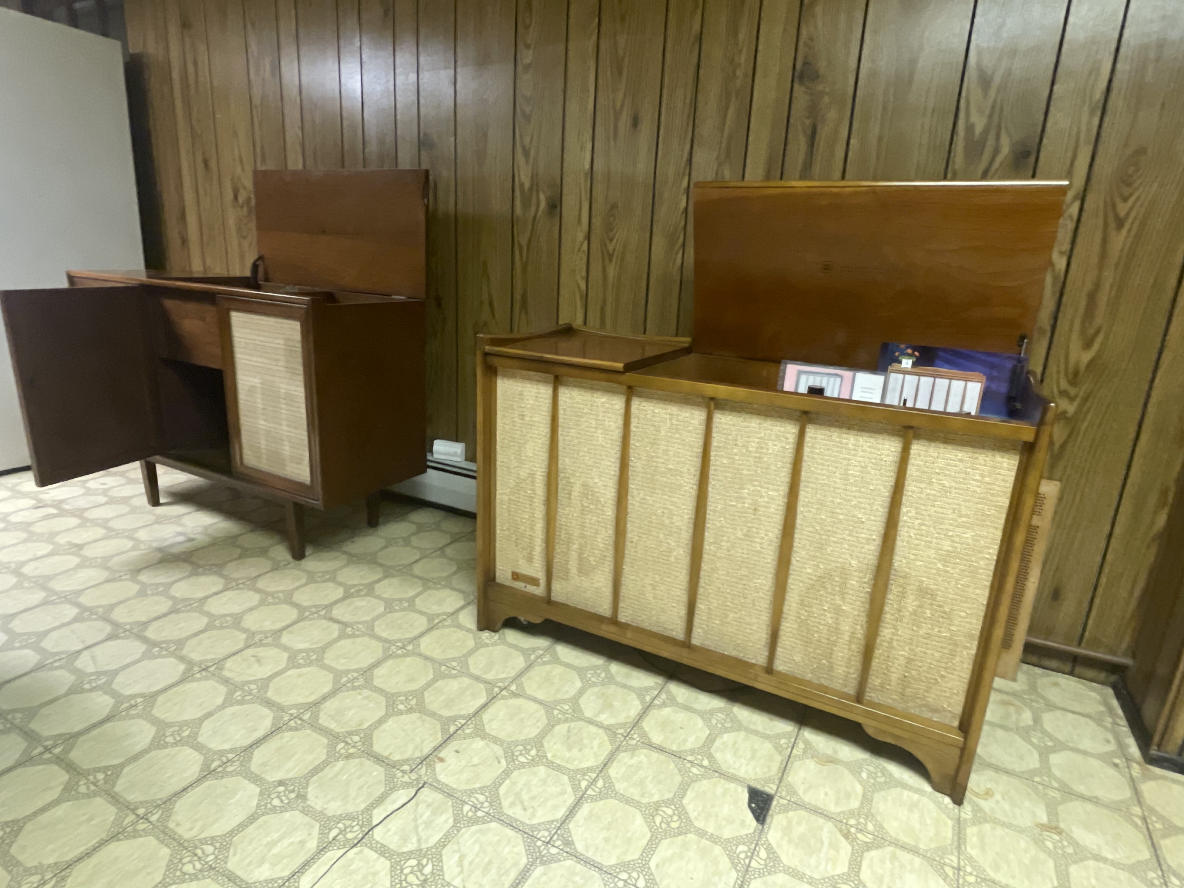 Sticky tile floor and dark wood paneling... so '60s! A perfect match for these early '60s consoles.