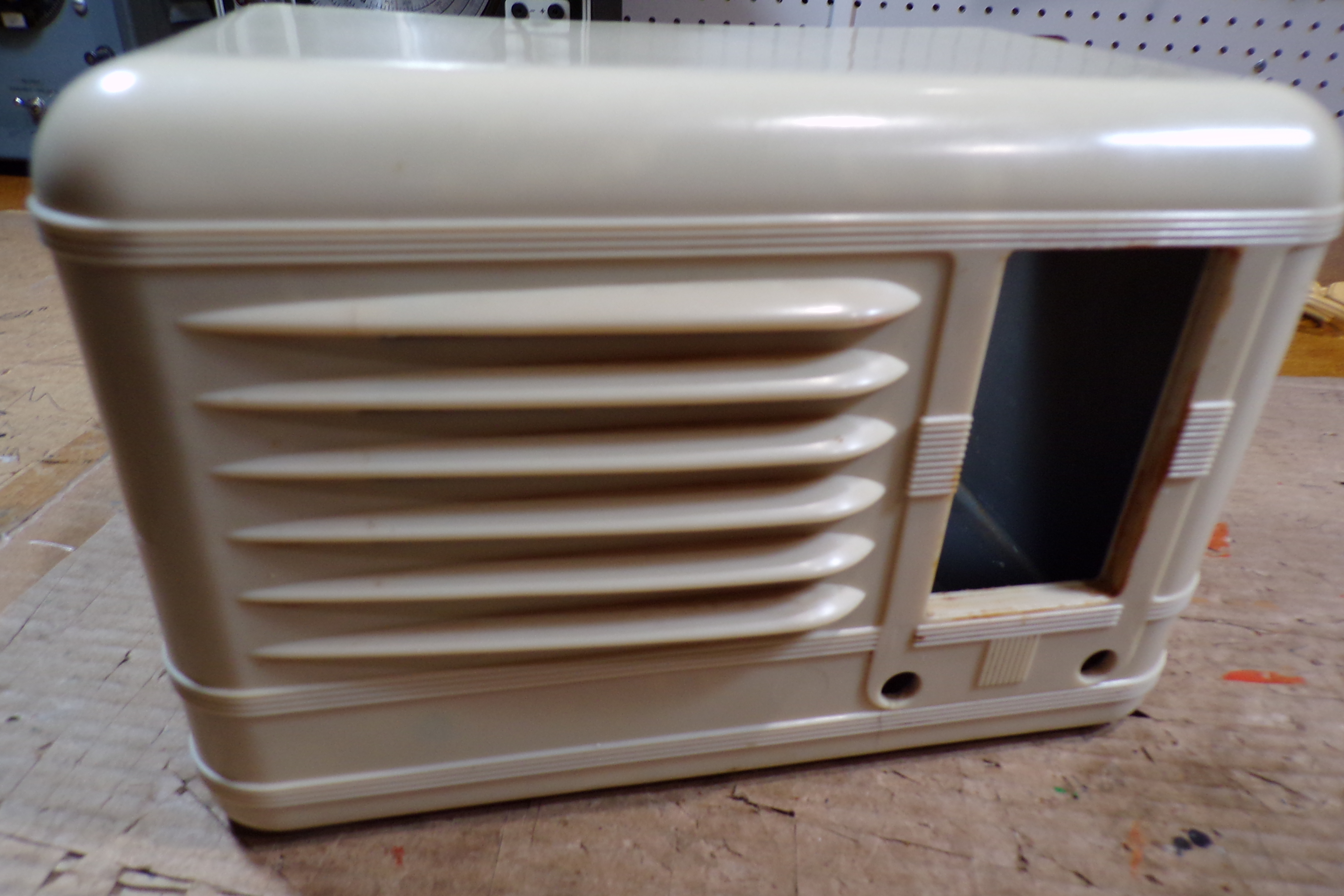 I have pictures, so please stand by for those. I have two of these small PB radios, one with a power transformer, one with series filaments. The model with the PT has a fairly heavy chassis, particularly on the end with the PT. The cabinet on the PT model was cracked. Just a simple crack, running from the screw that holds the chassis in to the front of the cabinet. No big deal, right? Well, not for me it wasn't. I glued the original crack, then reinforced it with epoxy on the inside. All was well until I used a furniture clamp to hold it together like I wanted. When I tightened the clamp, a huge chunk broke out of the middle and fell out. So, now, instead of having a cracked cabinet, I had a busted cabinet. This time, I glued and reinforced the second repair, then omitted the clamp. So far, so good. I need to use some body putty and glazing putty so my repairs won't show, then I'll repaint the entire cabinet. It is tan now, the wife likes a light green, so we'll shoot it with that. The cabinet with the series string chassis is really nice, dark brown bakelite. The chassis with the PT is a better performer than the other one. One of them has the wrong dial pointer, so I reckon I should see if I can find the correct pointer at some point.