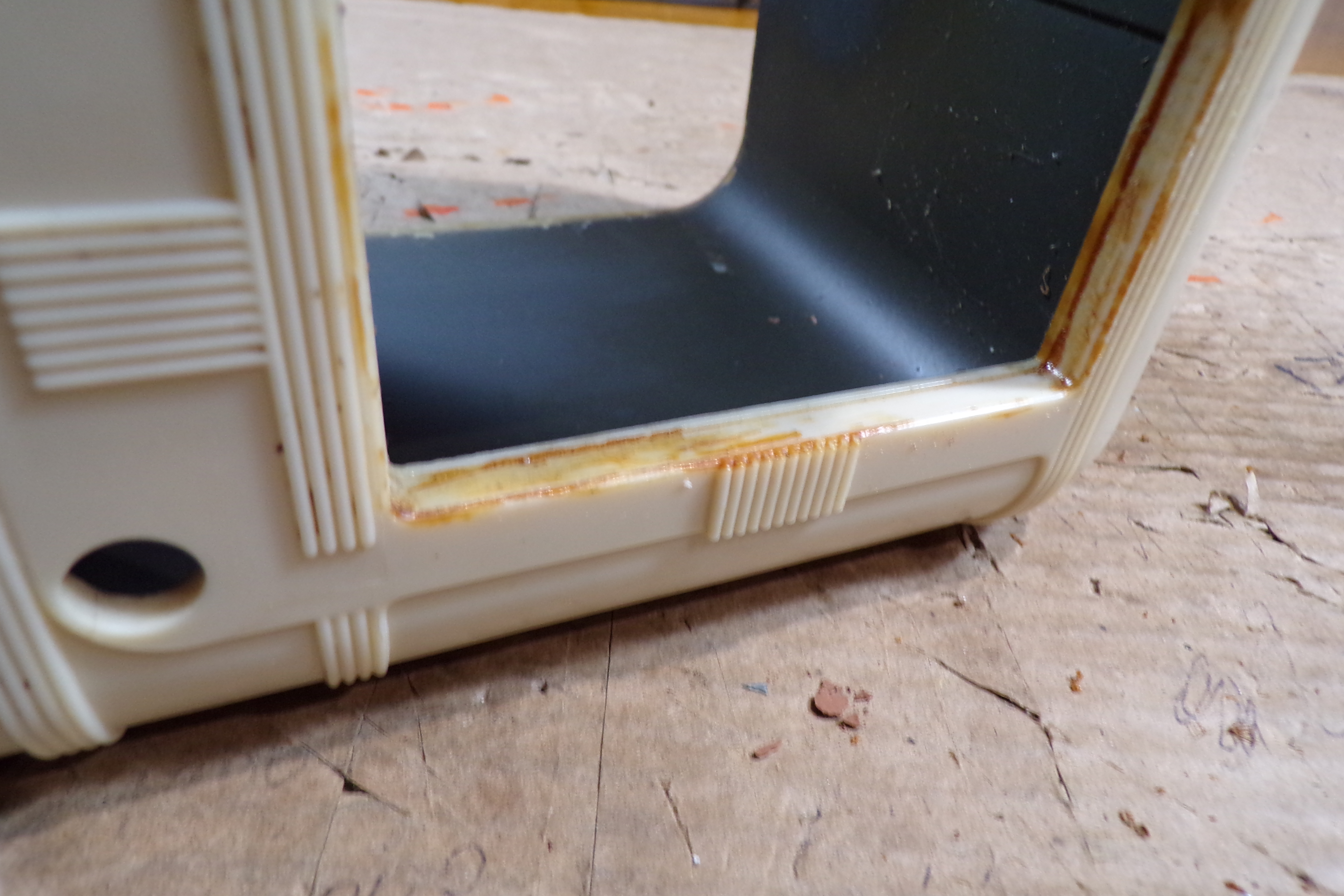 I have no idea what material the cabinet is made of, but Elmer's Construction glue won't stick to it. Nor will epoxy. I had the cabinet all fixed, looking pretty good. I started spreading Bondo on the cracks when the cabinet split in three pieces again. I can just peel the glue off in strips, the epoxy comes off in chunks prodded by a screwdriver bit. It must be some kind of plastic. It's not bakelite. It doesn't scratch easily. I plan to try model car cement to see what that does. Lacquer thinner doesn't hurt it, nor does acetone, nor does alcohol. I've never had this trouble before. Elmer's is what I have always used.