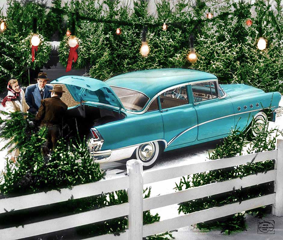In the mid-late '50s I walked by a dark green '55 Roadmaster sedan every day on my way to my Elementary School, a very dignified, imposing car owned by elderly folks, almost the same as the Christmas pic above but all one color. In my imagination the kind of automobile that a graying gentleman dressed in a black top-coat and Homburg hat would drive. Maybe 8 or 9 years later I had occasion to go down that same street where I hadn't been for a long time, since probably 1961 or '62. The poor car was still there, fading paint, covered by tree junk, chrome beginning to rust and pit. But it still looked so dignified and powerful, despite all those years of neglect, and that car still occupies a place of honor in my mind.