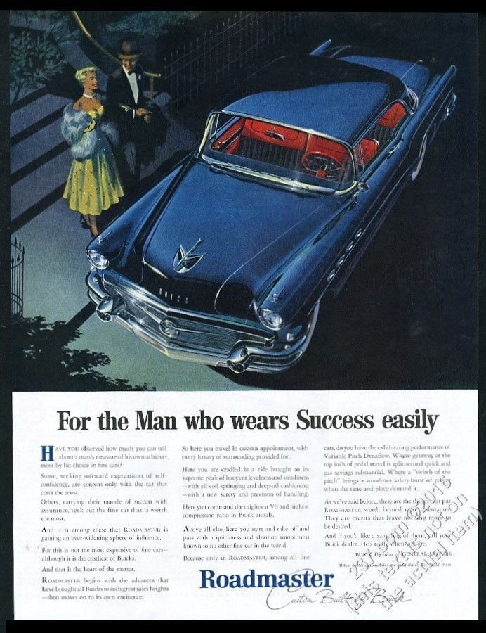 Buick's 1956 ad .. "the Man who Wears Success Easily" for me sums up the zenith of American power, a time when our cars and our economic and military power were so overwhelming they were essentially unchallenged. Though the Cold War had begun, most of the world's population knew who was in charge, and our cars were a perfect reflection of it. But by 1958 we entered overshoot: the Russians had beaten us to space in Oct 1957, 2 months later Vanguard exploded on the launch pad, the Russians had had the H bomb for awhile, SE Asia was on the verge of ignition, the "missile gap" was on everyone's mind, yet we clung to the idea of world dominance. The '58'59 cars reflected to me a superficial attempt to keep the optimism alive past it's sell by date, but like Harley Earl's career the handwriting was on the wall, and the results a flop, truly over the top ridiculous. JFK's shocking murder, the Viet war, and the turbulent '60s brought us, and our cars, temporarily back to earth, only to degenerate further into decadence during the debauched decade of the '70s. The innocent optimism was gone after 'Nam, and the substitute of faked opulence became a dead end of it's own. Being old I unapologetically like to lapse into nostalgia for that naive age when I was a child and the US was truly on top, and the '56 Roadmaster is it's personification in metal.