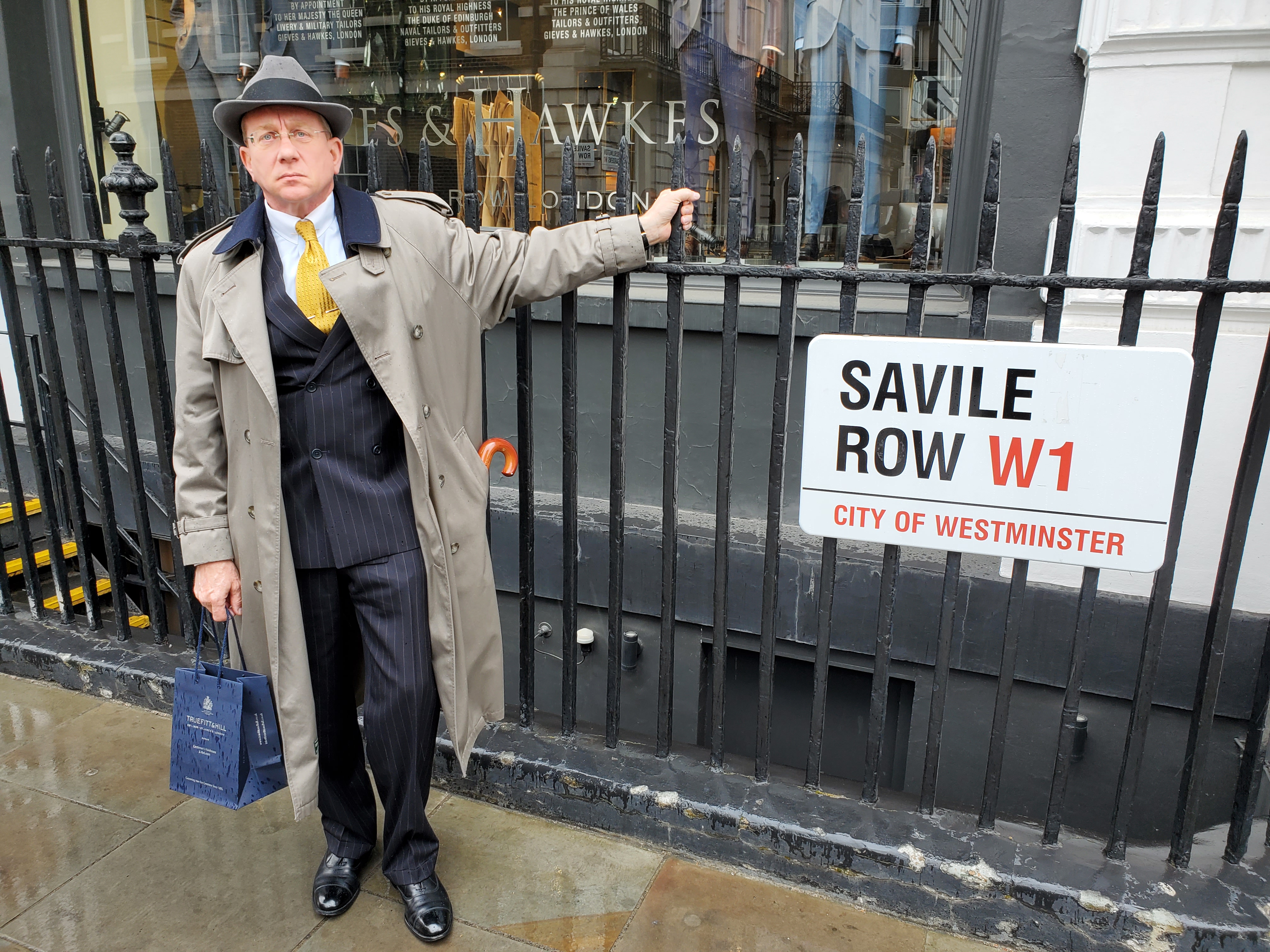 Saville Row, now that's the place for a pic like that! A raincoat often seen in that locale would be a Burberry, I used to have a knockoff.