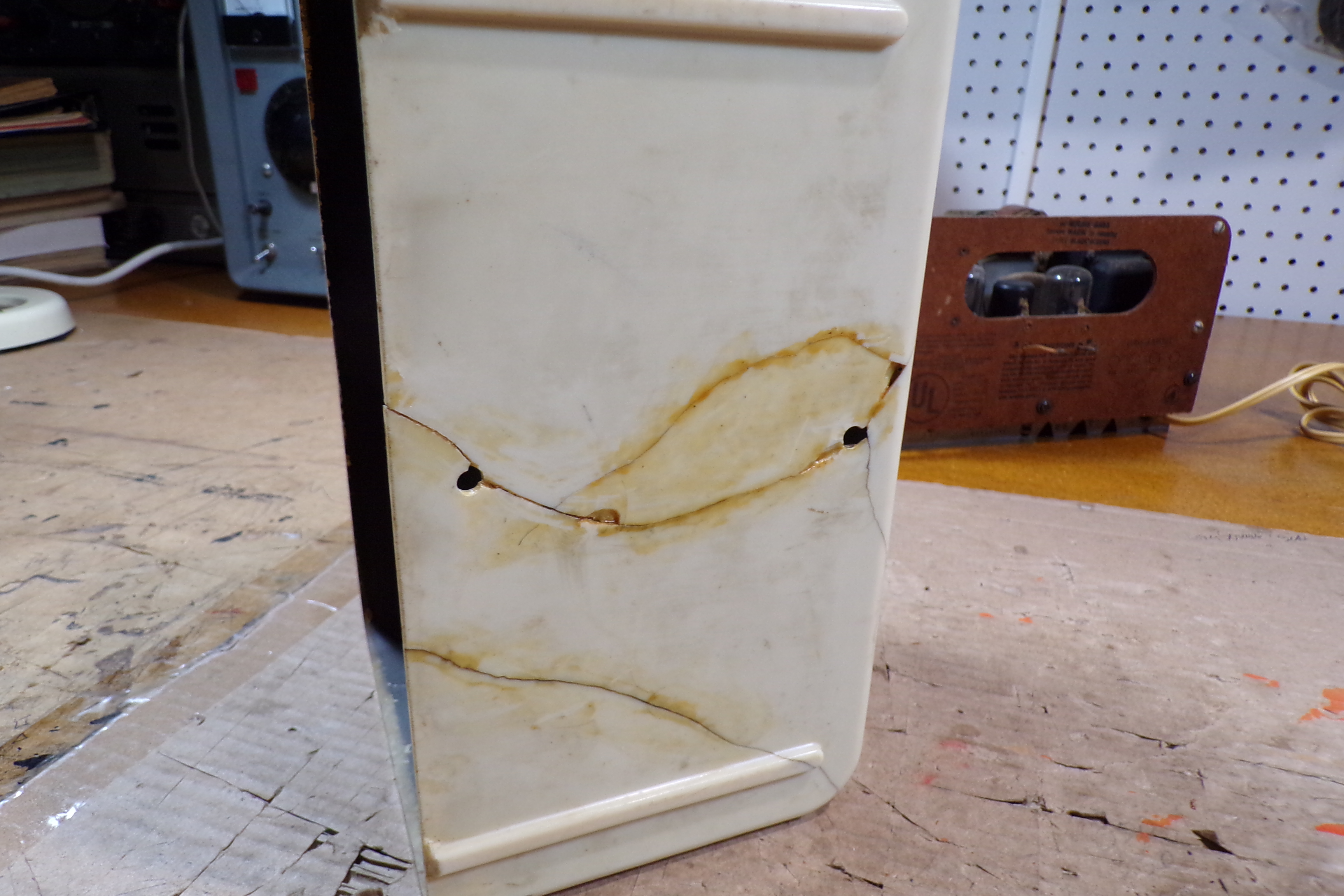 I have no idea what material the cabinet is made of, but Elmer's Construction glue won't stick to it. Nor will epoxy. I had the cabinet all fixed, looking pretty good. I started spreading Bondo on the cracks when the cabinet split in three pieces again. I can just peel the glue off in strips, the epoxy comes off in chunks prodded by a screwdriver bit. It must be some kind of plastic. It's not bakelite. It doesn't scratch easily. I plan to try model car cement to see what that does. Lacquer thinner doesn't hurt it, nor does acetone, nor does alcohol. I've never had this trouble before. Elmer's is what I have always used.