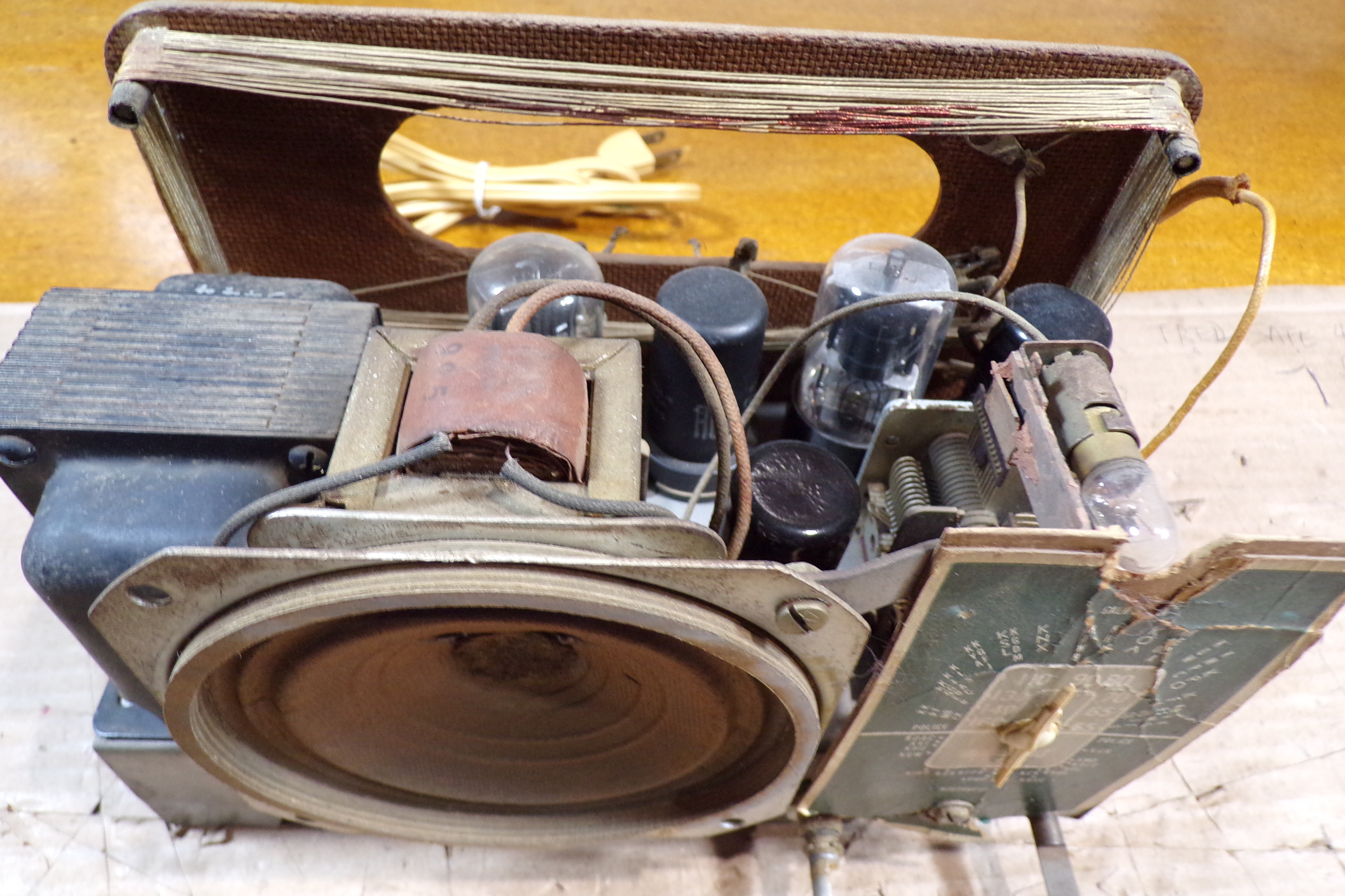 I have pictures, so please stand by for those. I have two of these small PB radios, one with a power transformer, one with series filaments. The model with the PT has a fairly heavy chassis, particularly on the end with the PT. The cabinet on the PT model was cracked. Just a simple crack, running from the screw that holds the chassis in to the front of the cabinet. No big deal, right? Well, not for me it wasn't. I glued the original crack, then reinforced it with epoxy on the inside. All was well until I used a furniture clamp to hold it together like I wanted. When I tightened the clamp, a huge chunk broke out of the middle and fell out. So, now, instead of having a cracked cabinet, I had a busted cabinet. This time, I glued and reinforced the second repair, then omitted the clamp. So far, so good. I need to use some body putty and glazing putty so my repairs won't show, then I'll repaint the entire cabinet. It is tan now, the wife likes a light green, so we'll shoot it with that. The cabinet with the series string chassis is really nice, dark brown bakelite. The chassis with the PT is a better performer than the other one. One of them has the wrong dial pointer, so I reckon I should see if I can find the correct pointer at some point.