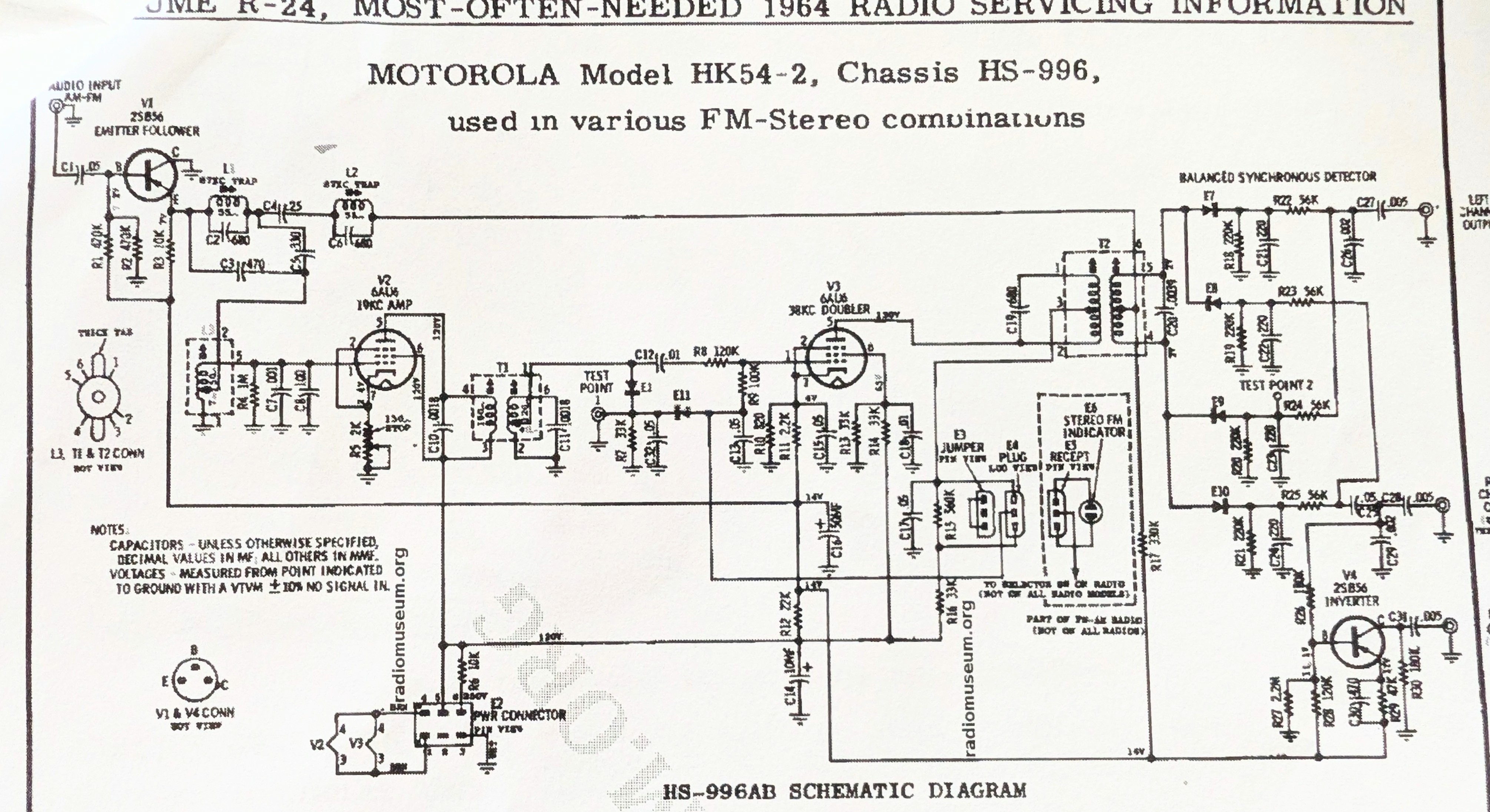 I'm guessing the filament voltage was not getting to the MPX unit, but the input transistor was still getting its DC, so the mono audio had a path to the center tap of the final transformer, and subsequently to the outputs. This schematic, (one of three different ones) most clearly shows that path in the upper horizontal line. So, I de-oxed all the Amperex connectors for the MPX power cable that goes to the tuner and the one from the power amp to the tuner. Now, the stereo light works (its not very selective, stays on or flashing most of the time while tuning) and stations actually have decent stereo separation! BTW, that output transistor stage, V4, is not actually present on my MPX.